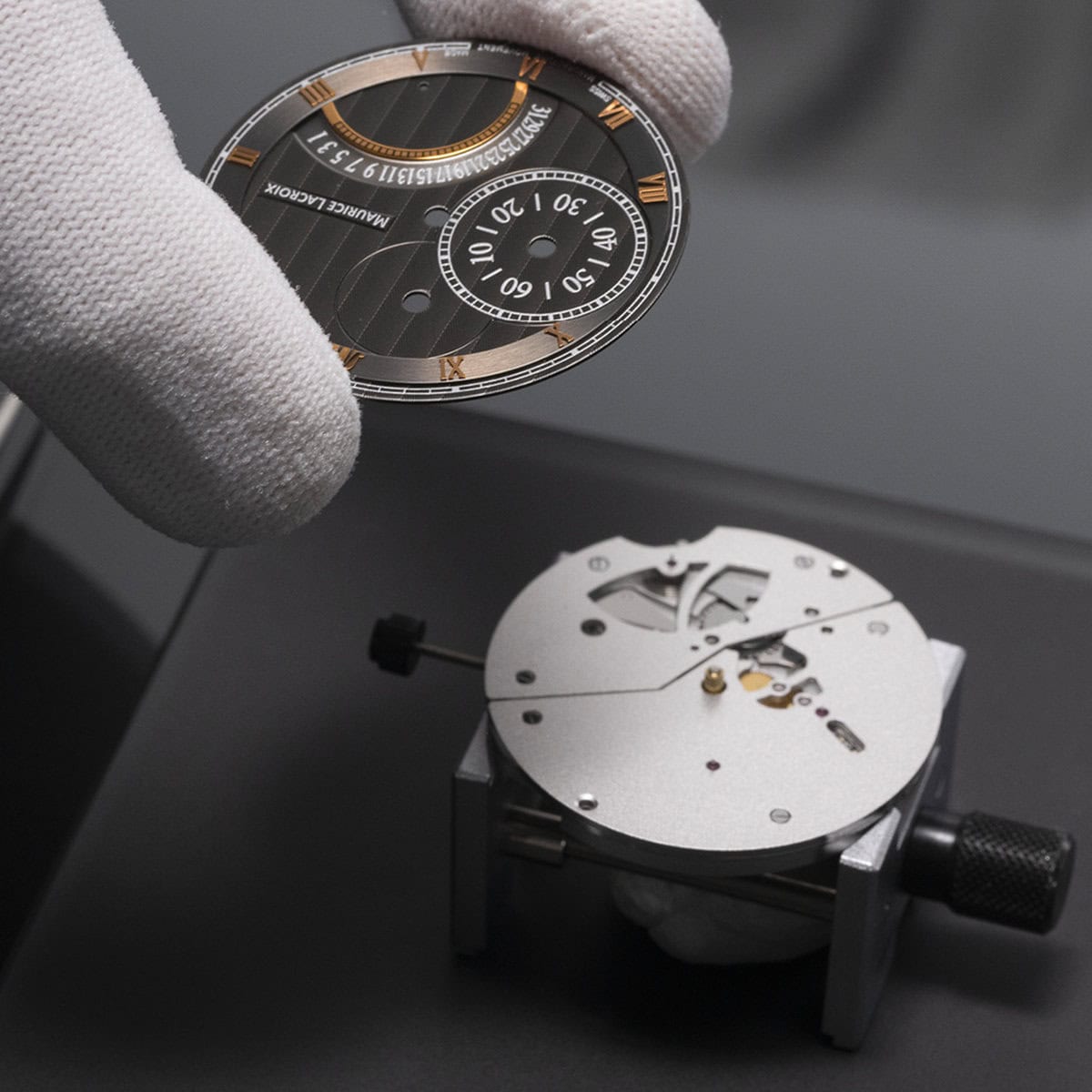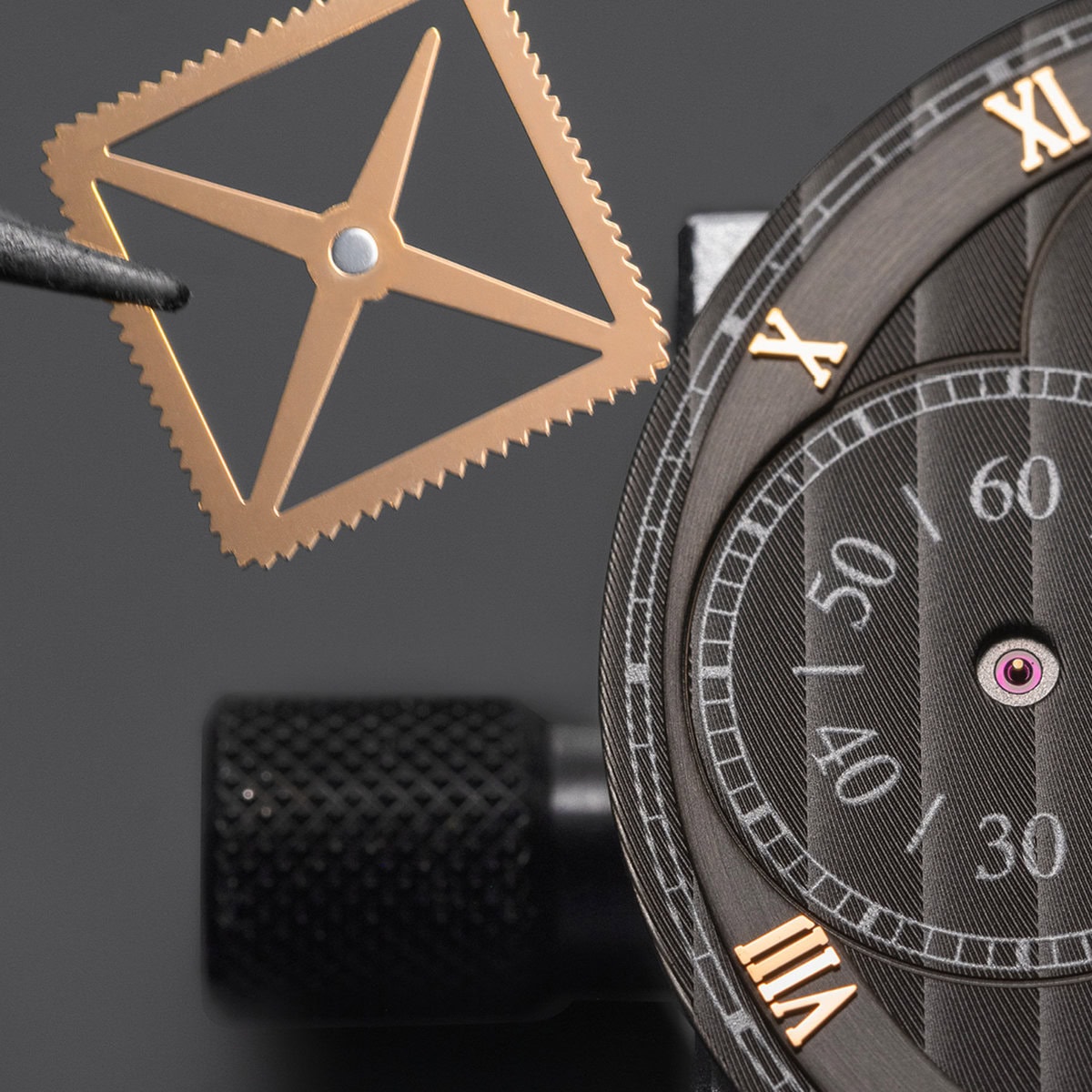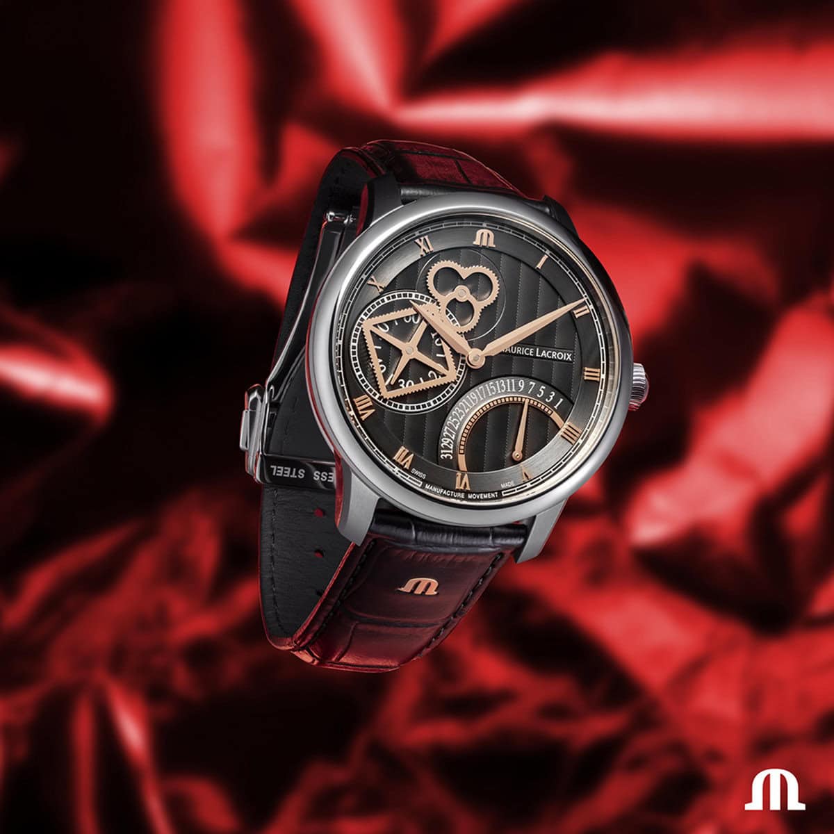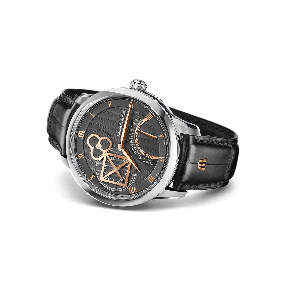 The watch includes a small seconds display by a square wheel at 9 o'clock, hours and minutes, and a retrograde calendar at 5 o'clock.