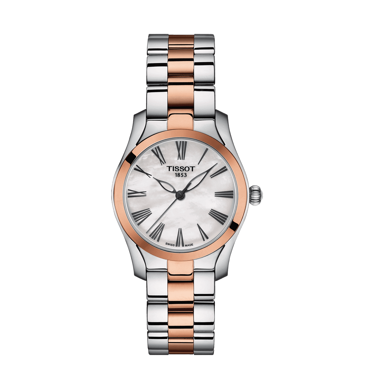 Women Watch. White mother-of-pearl dial color. Grey, Rose Gold 5N Stainless steel strap. Water-resistant up to a pressure of 3 bar (3 m / 1 ft).EOL (battery end-of-life indicator). Butterfly clasp with push-buttons. Domed scratch-resistant sapphire crystal. Swiss Quartz movement. Swiss made.