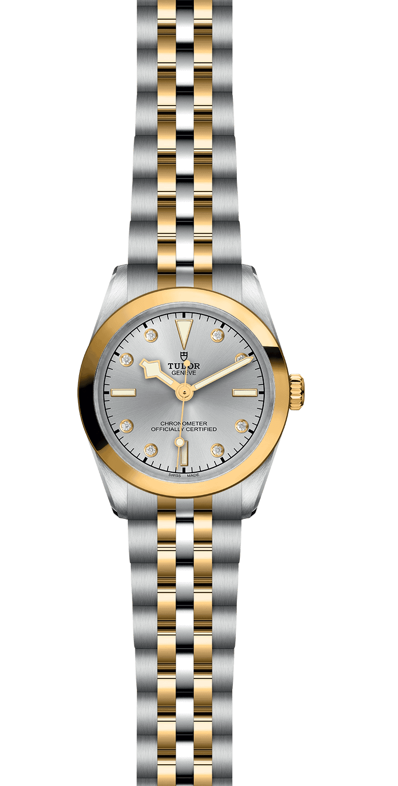 Screw-down winding crown with the TUDOR rose in relief. Steel covered by a 0.1mm yellow gold cap