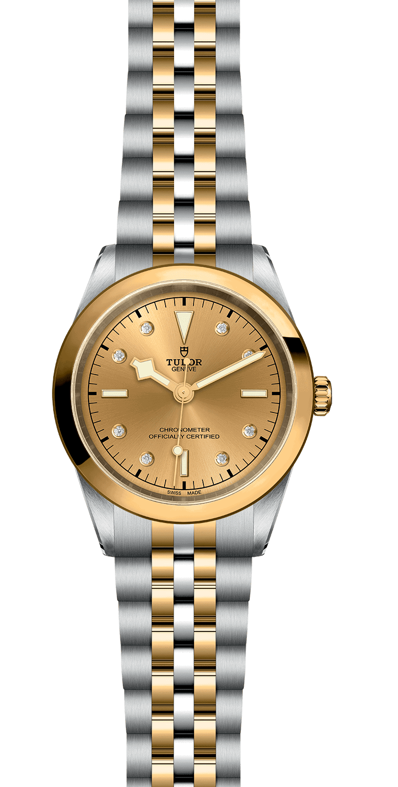 Screw-down winding crown with the TUDOR rose in relief. Steel covered by a 0.1mm yellow gold cap