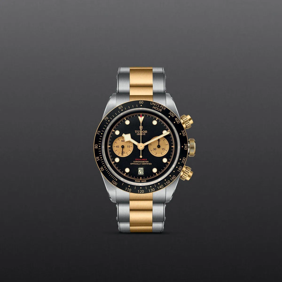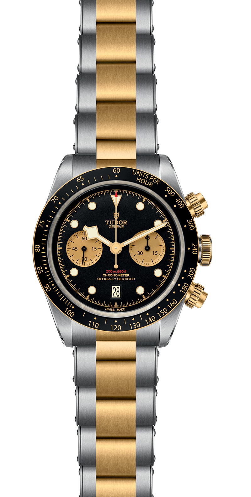 Screw-down winding crown with the TUDOR rose in relief. Solid yellow gold screw-down pushers at 2 and 4 o'clock. Steel covered by a 0.3mm yellow gold cap