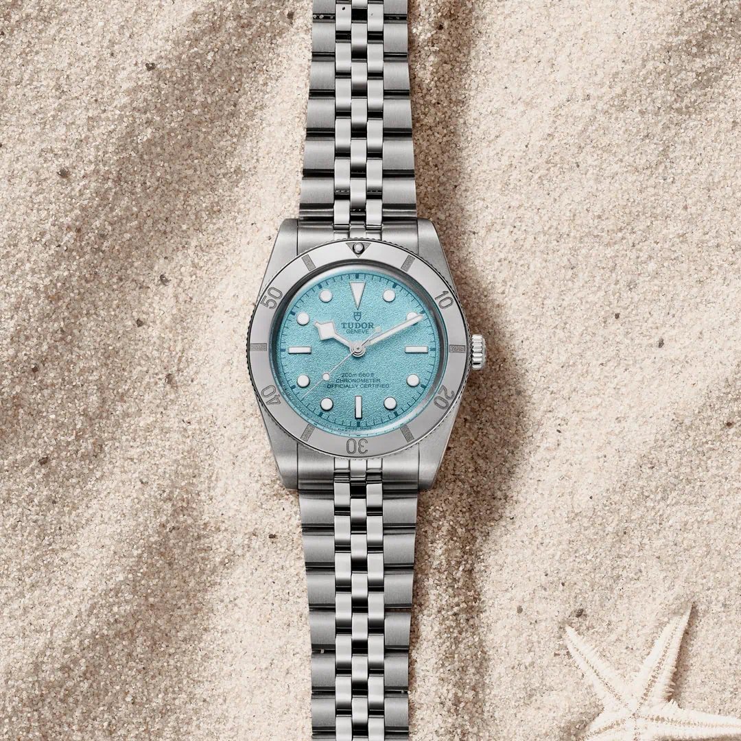 The Black Bay 54 is the most true-to-form example of TUDOR’s first dive watch, the reference 7922. The 37mm case retains the classic proportions of yesteryear yet boasts the technical prowess of TUDOR’s time-only Manufacture Caliber MT5400 and a 200m depth rating. A special version dubbed “Lagoon Blue” is inspired by the colour of tropical oceans and features a sand-textured “Lagoon Blue” dial, a five-link bracelet and a mirror-polished bezel.